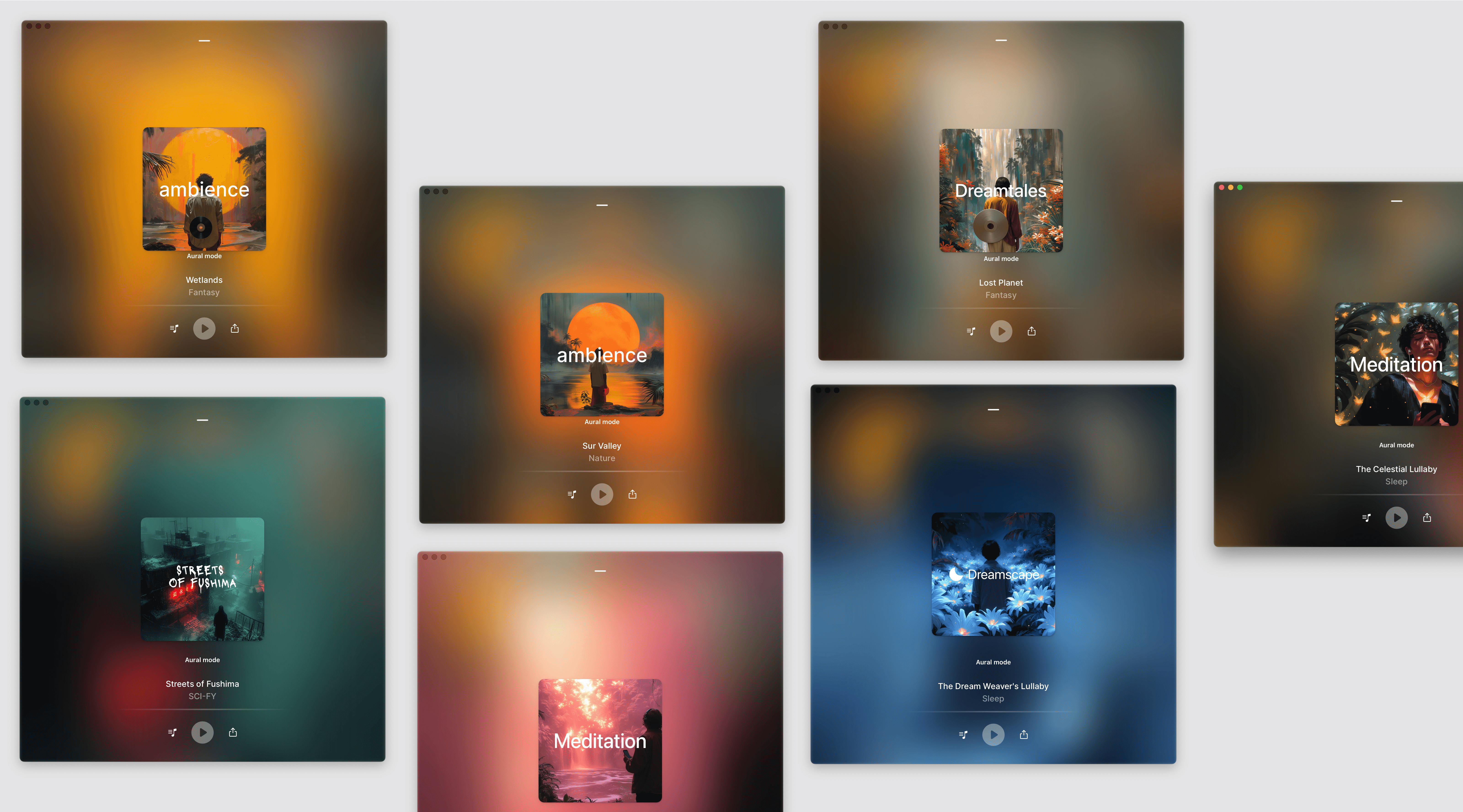Designing auditory sanctuaries for modern minds. Aural Sounds is a minimalist audio platform crafted to help users enter states of deep focus, calm, or creative flow. The product offers a curated collection of ambient soundscapes — from subtle drones to textured field recordings — presented through a clean, distraction-free interface. The design approach was centered around clarity and mood. Soft gradients, gentle transitions, and responsive audio controls create a sensory experience where sound takes the lead and UI steps into the background. Users can intuitively explore moods or build custom mixes, all within an interface that feels more like a space than a tool. This project explores how UX/UI can amplify emotional impact through restraint, simplicity, and sound-first interaction.